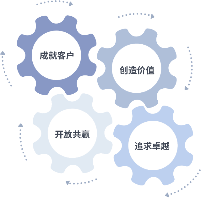 成就客户是一切决策的出发点,,,,创造价值是衡量所有工作的标准,,,追求卓越是我们做事做人的态度,,,开放共赢是我们的格局也是最终的结果。。价值观的齿轮环环相扣,,,推动着组织里的每个人不断向前。。。
